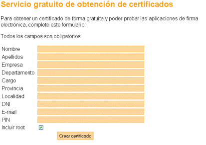 Este servicio genera ficheros PKCS#12, semejantes a los de los backups de certificados. Se cifran con el PIN que se indica en el formulario y que se tiene que recordar al instalarlos en el ordenador. El fichero resultante incluye una clave privada y el certificado, y, opcionalmente, la cadena de certificación hasta la «root«. Al usarlo, conviene recordar que es preciso marcar la casilla de «incluir root» si es un certificado para ser usado con una aplicación de usuario (ya que de esta manera se instala la cadena de confianza de la CA emisora en el ordenador). Si se va a usar en una aplicación java es mejor no marcar la citada casilla y obtener el certificado de la CA «root» en la siguiente panatalla, tras hacer click en «crear certificado».