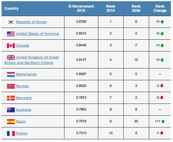 Por un comentario de Ramiro Oliva me he enterado de esta estadística en la que España se situa entre los 10 mejores paises del mundo en implantación del eGovernment (eAdministración).