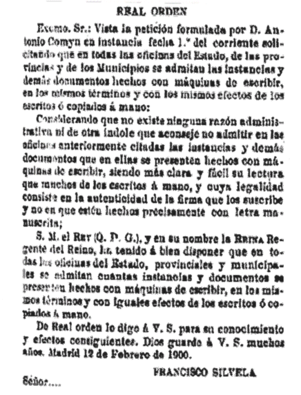 “S.M. el REY (Q.D.G.), y en su nombre la REINA Regente del Reino, ha tenido á bien disponer que en todas las oficinas del Estado, provinciales y municipales se admitan cuantas instancias y documentos se presenten hechos con máquinas de escribir, en los mismos términos y con iguales efectos de los escritos ó copiados a mano.”