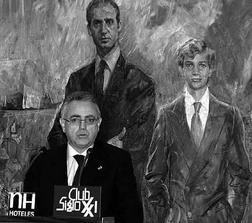 El presidente Miguel Sanz, con una pintura del Rey y del Príncipe detrás, durante la conferencia en el Club siglo XXI. MODEM PRESS