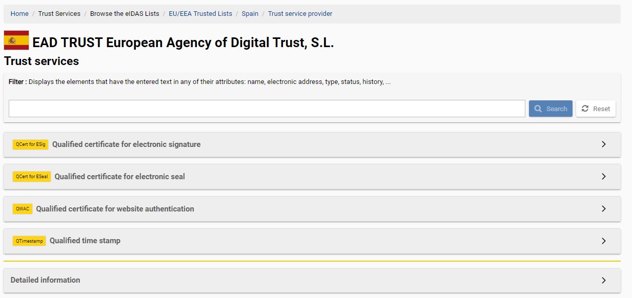 Se pueden comprobar los servicios cualificados a través del portal «Cuadro de Mandos» (Dahboard) EIDAS de la UE. Estos son los servicios cualificados referidos a EADTRUST