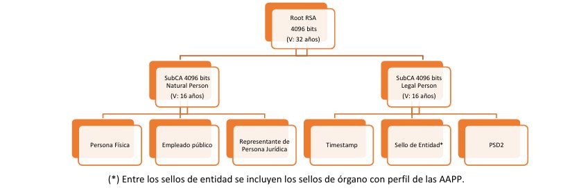 - RSA Root CA 4096-bit key size with SHA256 digest algorithm para certificados cualificados.