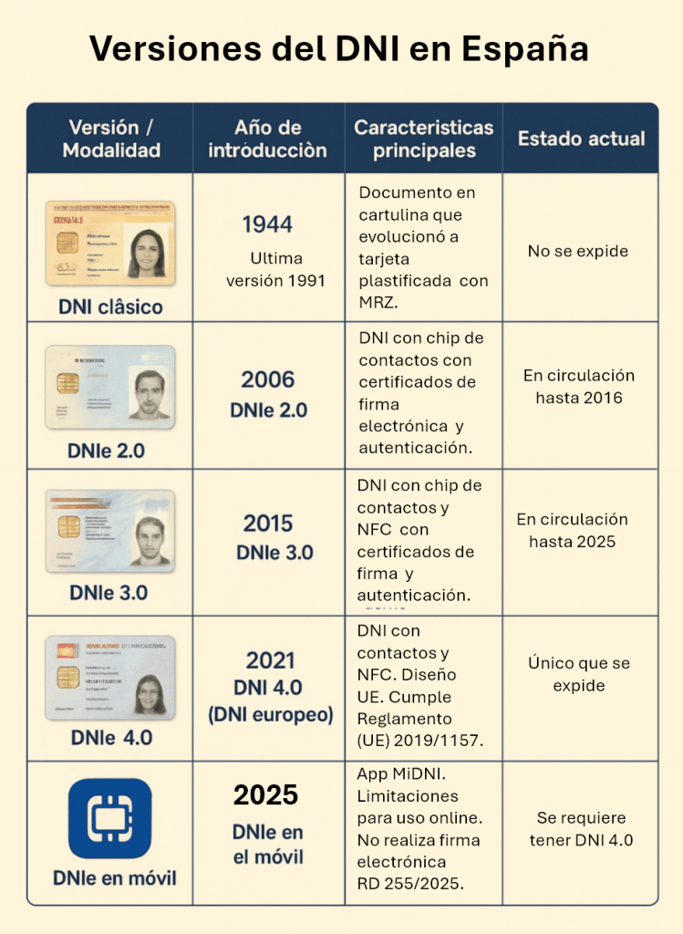 En España se han producido varias versiones de DNI, incluyendo 3 versiones electrónicas y una App: