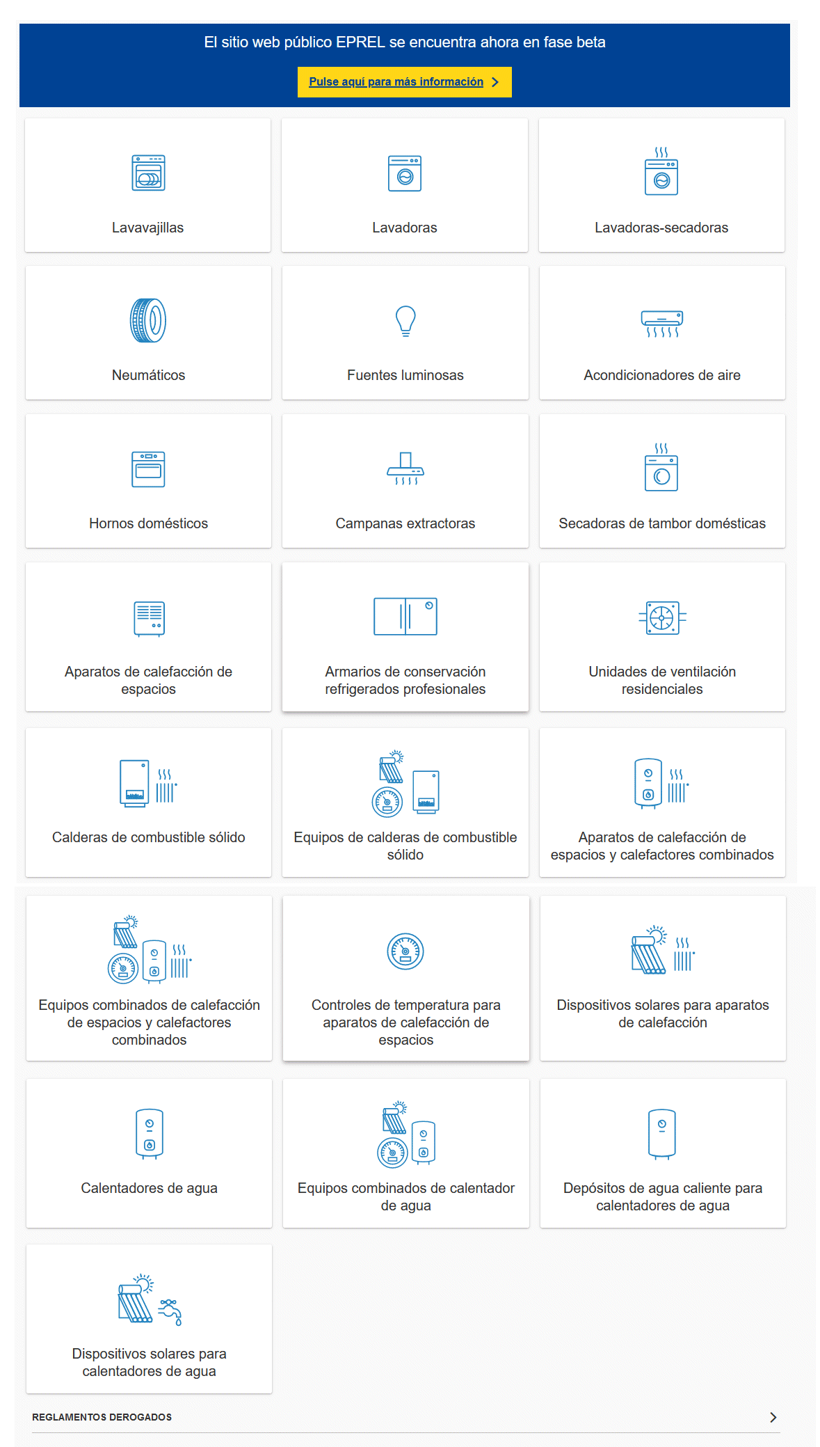El sistema del EPREL proporciona información sobre los productos relacionados con la energía regulados por los Reglamentos Delegados adoptados en virtud del Reglamento (UE) 2017/1369, de la Directiva 2010/30/UE del Parlamento Europeo y del Consejo y, en el caso especial de los neumáticos, en virtud del Reglamento (UE) 2020/740 del Parlamento Europeo y del Consejo.