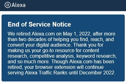 Alexa Traffic Rank, ha desaparecido el día 1 de Mayo de 2022. Aunque, según parece, se había anunciado la discontinuación (o finalización) del servicio, a mi me ha pillado por sorpresa y me he enterado cuando me ha avisado el plug-in de mi navegador.