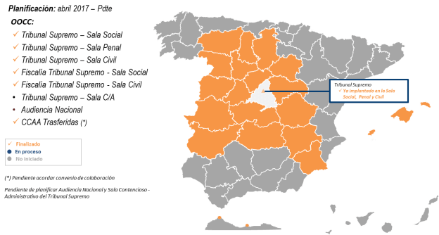 - Fase III (2017 y 2018). La fase III integra a 86 partidos judiciales, los órganos centrales (Tribunal Supremo y Audiencia Nacional) y 39 Fiscalías del ámbito territorial del Ministerio de Justicia. La complejidad de la implantación se incrementa durante esta fase debido a la dispersión geográfica y el elevado número de sedes aunque el volumen de tramitación sea menor al ya realizado en las Fases I y II. El proceso de despliegue en los órganos judiciales está previsto que finalice en el mes de marzo de 2018. La culminación en los órganos centrales y Fiscalías se realizará a lo largo de 2018 conforme al calendario que se establezca de forma consensuada. Actualmente se ha realizado la implantación en 78 partidos judiciales, orden penal y social del Tribunal Supremo y 17 Fiscalías.