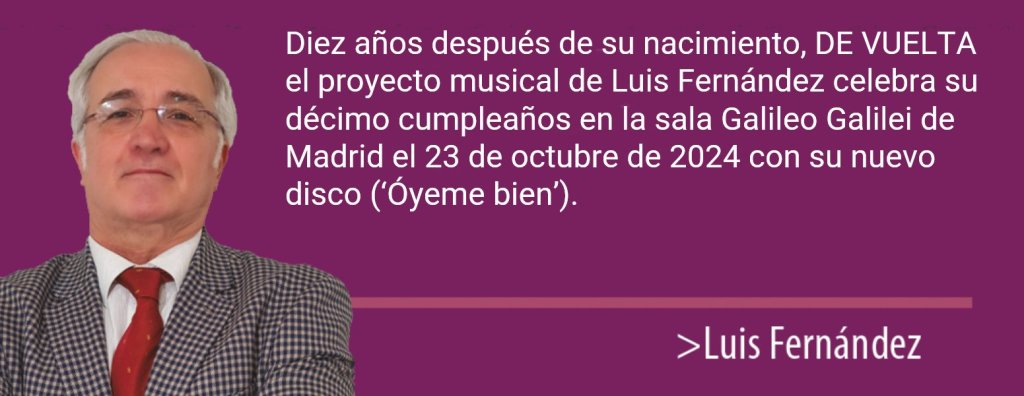 «De Vuelta» el proyecto musical de Luis Fernández Delgado cumple diez años y lo celebraremos con un concierto para recordar siempre, en la sala Galileo Galilei de Madrid el 23 de octubre de 2024 a las 21:00, en el que presenta nuevo disco «Óyeme bien«, más canciones propias y versiones inéditas.